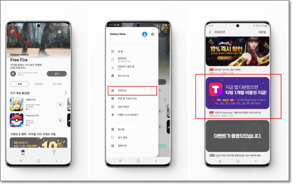 Galaxy Store 앱 가장 상단 왼쪽에 보면 삼선으로 표시된 메뉴바가 있는데 클릭해 줍니다. 그러면 표시되는 메뉴 항목에서 '프로모션'이라는 것을 볼 수 있고 이것을 선택하면 여러 프로모션 항목 중 '티빙 1개월 이용권 지급'이라는 배너를 볼 수 있습니다.